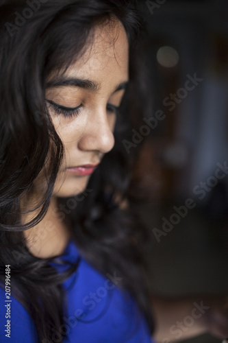 indoor, human face, female, fashion model, fashion, elegance, brown hair, beauty, beautiful, adult, indian, asian, missy, young adult, woman, sorrowful, sad, portrait, people, pensive, one person, looking down, looking, long hair, lifestyle, woman, girl, person, adult, 20s, young adult, young person, grown-up