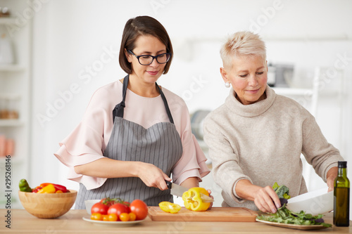 adult, adults only, apron, casual clothes, cheerful, chopping, cooking, cutting, chopping board, dieting, domestic life, food, food and drink, freshness, happiness, healthy eating, healthy lifestyle, home interior, indoor, kitchen, kitchen knife, lifestyle, looking, mature adult, meal, people, preparation, salad, smiling, standing, table, togetherness, two people, vegetable, vegetarian food, woman, missy, family, mother, daughter