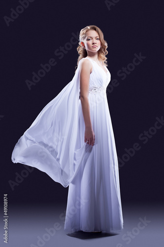 20, 25, beautiful, blond, blond, dark, dress, fashion, full, glamour, length, long, 1, portrait, pretty, single, studio, white, woman, young