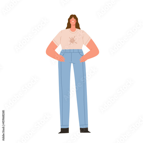 Young woman in casual outfit. Modern smiling female character standing isolated on white background. Cartoon flat vector illustration.