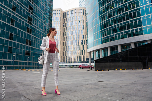 woman, young, chequered, jacket, pant, white, pattern, business, city, building, wall, street, show, posing, walk, emotion, bag, sexy, morning, day, light