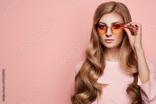 Young woman in elegant sunglasses. Blond hair, pink dress, isolated studio shot. Fashion lookbook. Brunette girl with long healthy and shiny curly hair