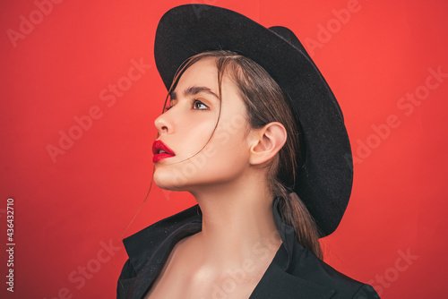Young woman in fashion hat. Beauty woman face portrait in studio. Beautiful girl with clean skin, natural make-up.