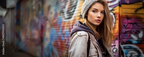 female, blonde hair, beanie, hat, jacket, graffiti, wall, street art, urban, city, portrait, looking, standing, casual clothes, fashion, model, woman, people, daytime, bright, colours, vibrant, street, young, adult