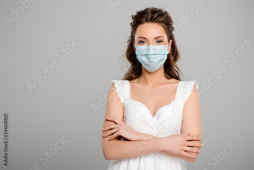 blue, background, equipment, girl, caucasian, health, medicine, health care, disease, protection, care, european, pose, woman, racked, protective, disease, safety, virus, flu, disease, medicare, corona, epidemic, pandemic, quarantine, copy space, one person, studio shot, young adult