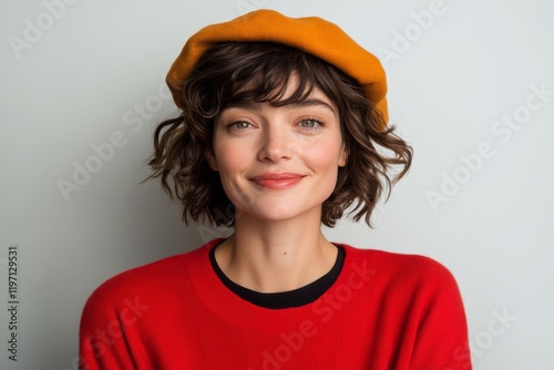 woman, beret, curly hair, smile, red sweater, daylight, cheerful, fashion, portrait, youthful, accessory, confidence, minimalistic, happy, vivid colors, casual clothes, expression, beauty, style, personality, indoor, elegance, vibrant, modern, trendy, optic, character, gaze, warmth, closeup, lifestyle, atmosphere, emotion, friendly, softness, serenity, appearance, culture