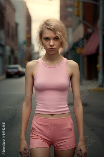 young woman in pink outfit standing in alley