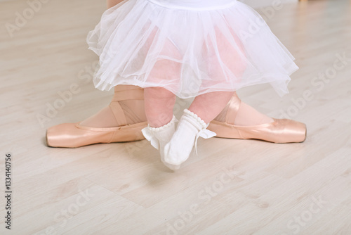 ballet, ballerina, baby girl, missy, dance, bonding, white dress, wooden floor, tenderness, motherhood, ballet shoes, dancefloor, leg, foot, family, connection, childhood, innocence, artistry, elegance, movement, tutu, sock, expression, closeup, emotional, nurturing, graceful, parenting, intimate