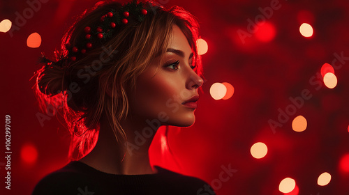 Young woman in profile adorned with festive decorations, illuminated by warm red lights