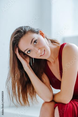 dress, red, woman, person, 1, adult, young, female, girl, beautiful, beauty, 20s, caucasian, studio, model, fashion, attractive, style, slim, people, pretty, european, graceful, lady, elegant, brunette, indoor, white, interior, positive, to sit, sitting, day, bright, cute, portrait, look, face, smile