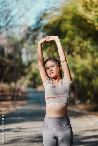 Young woman in sportswear stretching her arms overhead, embracing a healthy lifestyle in a natural outdoor setting.