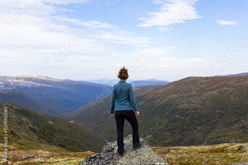 Young woman in Stegastein view point road, south Norway. Europe