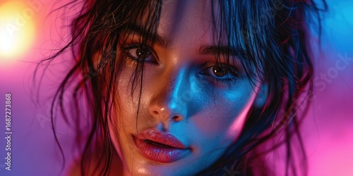 missy, closeup, portrait, pink, blue, modern, mystery, allure, dynamic, facial features, expression, fashion, beauty, artistic, atmosphere, creative, dramatic, highlight, glow, colourful, contemporary, moody, female, model, youth, style, freckle, editorial, sultry, glamour, futuristic, chic, urban, trendy, cosmetic, aesthetic, visual arts, digital artwork, stunning, nightlife