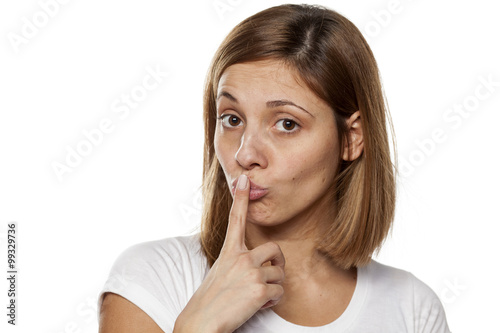 woman, face, emotion, positive, finger, kissing, beautiful, female, caucasian, attractive, brunette, posing, constructed, up, no, make-up, white, background, beauty, model, studio, girl