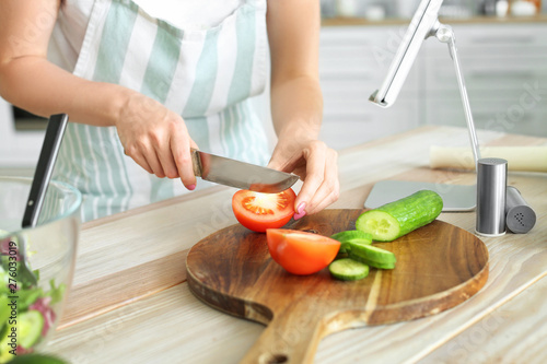 adult, apron, background, beautiful, blog, board, casual attire, caucasian, closeup, clothes, computer, cook, cooking, cucumber, culinary, cutting, diet, eat, female, food, fresh, girl, hand, hobby, home, homemaker, indoor, ingredient, kitchen, knife, leisure, making, meal, nourishment, online, people, person, prepare, receipe, salad, table, tablet, tasty, tomatoes, vegetable, woman, young
