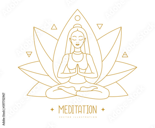 Young Woman meditation in lotus position with four elements ans Ether. Lotus flower sign. Vector illustration