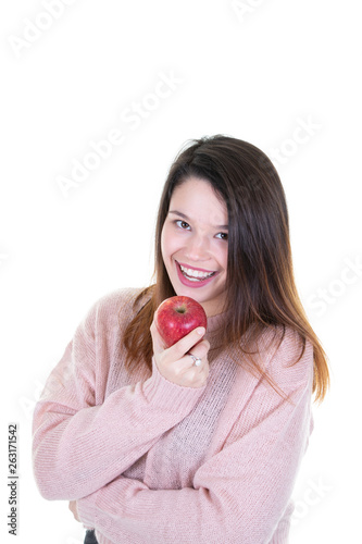 young, woman, white, background, red, apple, fruit, food, happiness, portrait, beautiful, beauty, person, happy, people, face, hair, model, smile, cute, hand, considering, laugh, cheerful, tempted, lady, girl, brunette, eye, healthy, diet, expression, female, isolated, health, caucasian, attractive, pretty, lifestyle