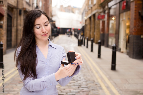 woman, girl, young, lady, female, person, pretty, cute, beautiful, attractive, holding, ring, jewellery, box, happy, smile, street, gift, present, proposal, propose, engagement, romantic, romance, love, sexy, looking, checking, check, happiness, caucasian, people, wife, valentine, woman, proposing, beauty, commitment, diamond, expression, reaction, human relationships, adult, luxury, engaged, fiance