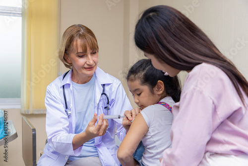 Young woman pediatrician performs a vaccination of a little girl. Looks at the doctor.