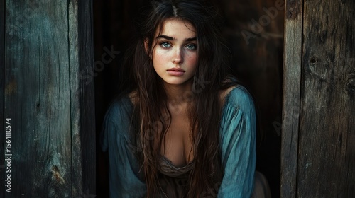 woman, girl, portrait, female, model, fashion, long hair, dark hair, dress, teal, clothing, wooden, wall, dark, toned, studio, natural light, closeup, attractive, beauty, pretty, human face, expression, seated, still life, color image, high-quality, people, indoor, fashion model, photo, pretty woman, photo, image, woman