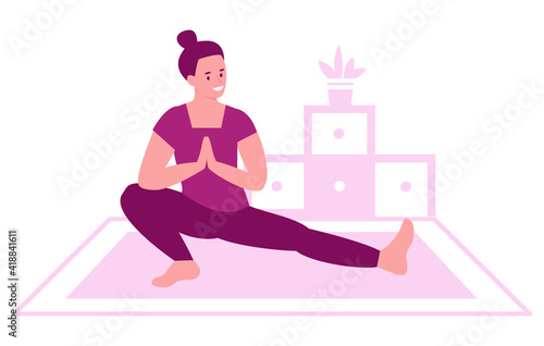 Young woman practices yoga at home. The concept of daily exercise, healthy lifestyle. Vector illustration in flat style.