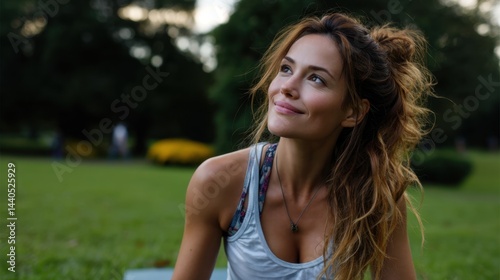 Young woman practicing yoga outdoors in a peaceful park during daytime, peaceful expression, natural setting, fitness, meditation