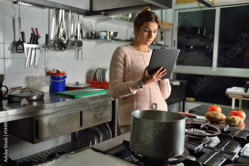 woman, adult, young, caucasian, racked, read, hold, look, receipe, kitchen, hob, utensil, vegetable, wireless, technology, connection, communication, lifestyle, casual attire, indoor, day, alone, 1, people