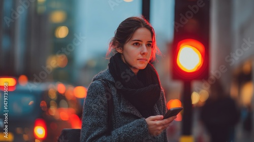 Young woman scrolling through her phone while waiting at a red light, casual urban background