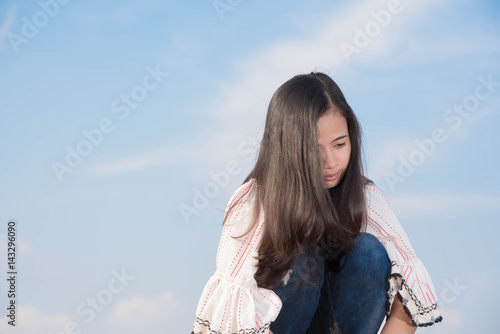 Young woman sitdown so sad on the mountein to sky background