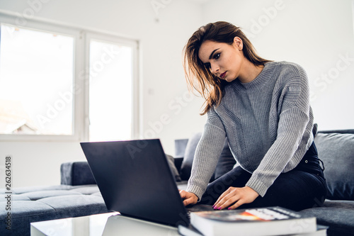 woman, laptop, computer, home, technology, young, sofa, casual attire, lifestyle, caucasian, female, people, modern, person, couch, sitting, cyberspace, beautiful, indoor, leisure, relaxation, work, relax, 1, beauty, communication, white, house, happy, living, smile, attractive, girl, notebook, adult, wireless, copy space, freelancer, business, room, cute, life, looking, device, apartment, woman, student, working, hand, conversation