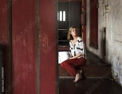 adult, alone, architecture, beautiful, blond, building, casual attire, cheerful, design, dreaming, female, girl, happiness, happy, home, house, indoor, leisure, lifestyle, looking, mature, old, people, person, pretty, relaxed, rest, room, sitting, smiling, stair, structure, style, thinking, thoughtful, well, woman, wooden, young