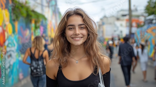 Young woman smiling confidently while standing in front of vibrant urban graffiti wall on a lively city street