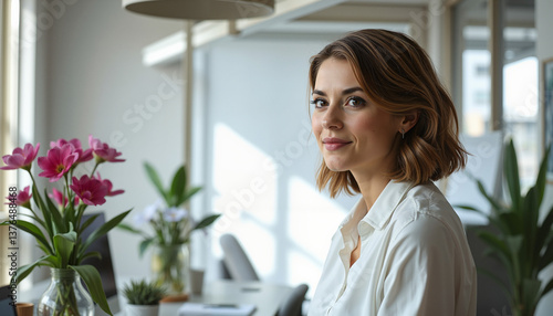 woman, smiling, office, plant, bright, indoor, natural, young, professional, lifestyle, happiness, calmness, work, positivity, femininity, casual attire, success, beauty, serenity, green, flower, sunlight, soft, modern, cheerful, productive, comfort, contentment, environment, relaxation, creative, fresh, elegance, home, decorative, inspiration, calm, peaceful, wellness, joy, satisfaction, contemporary, style, harmony, motivation, health, energy, collaboration