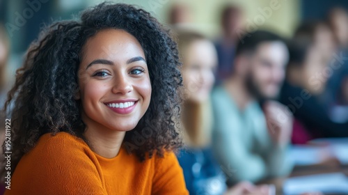 woman, smile, university, classroom, lecture, student, education, engagement, happiness, curly, hair, young, adult, learning, positive, energy, interaction, sharpened, peer, academic, setting, participation, communication, casual attire, clothing, joyful, expression, diverse, group, youth, cognition, studying, environment, camaraderie, enthusiasm, motivation, personal, growth, empowerment, teamwork, collaboration, inspiration, social