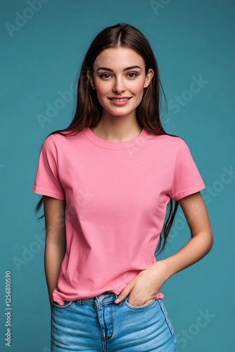 woman, smiling, young, pink, t-shirt, blue, background, beautiful, girl, happy, portrait, fashion, casual attire, style, female, 1, person, adult, isolated, studio, brown hair, long hair, jean, space, positive, emotion, youth, freshness, looking, trendy, attractive, lady, cute