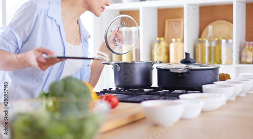 cooking, woman, kitchen, soup, cook, pan, young, stove, apron, female, pot, standing, homemaker, meal, vegetable, happy, beautiful, girl, spoon, chef, people, person, food, caucasian, home
