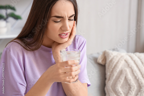 Young woman suffering from toothache with cold water on sofa at home, closeup