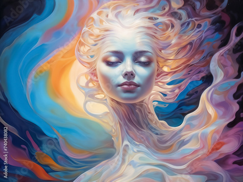 Young woman surreal painting with long curly hair fluttering on the wind