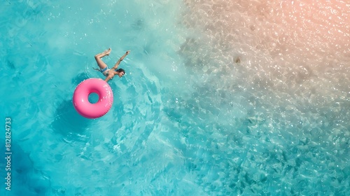 Young woman swimming on pink inflatable donut in turquoise sea aerial top view Concept banner travel beach resort : Generative AI