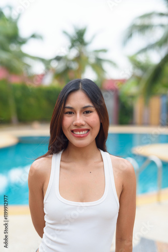 swimming pool, pool, missy, asian woman, beautiful woman, resort, palm tree, vacation, leisure time, happy woman, smiling woman, natural beauty, beach resort, nature, people, person, woman, young, smiling, beauty, smile, summer, outdoors, brunette, lady, face, happiness, model, fashion, hair, 1