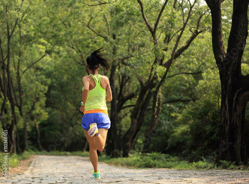 young woman trail runner running in forest