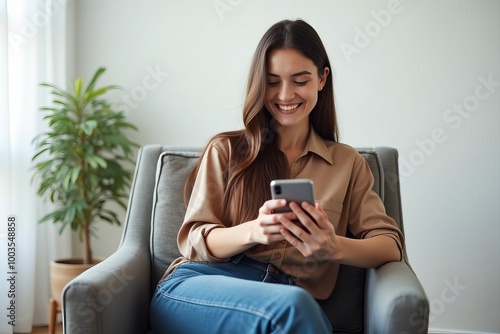 young, woman, smartphone, living room, modern, lifestyle, mobile, technology, using, communication, social, media, relaxed, comfortable, chair, home, casual attire, browsing, texting, app, cyberspace, connected, digital, device, brunette, indoor, plant, decor, leisure, work, online, content, engagement
