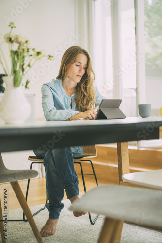 young, woman, tablet, home, home office, computer, adult, people, independence, cyberspace, wi-fi, occupation, sitting, working, german, alone, 1, flat, online, single, technology, mobility, connection, freelancer, lifestyle, caucasian, wireless, lifestyle, long hair, portrait, indoor, desk, accessibility, barefoot beach, chair, selective focus, casual attire, day, convenience, job, communication