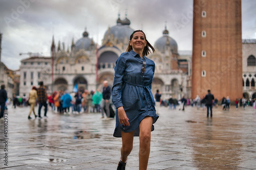 Young woman walking through St. Mark's Square, Venice, Italy.