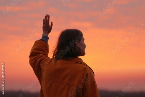 young, woman, waving, hallo, sunrise, morning, summer, greeting, outdoors, nature, sun, happiness, positive, daylight, dawn, fresh, freedom, cheerful, sky, beauty, horizon, peaceful, joy, light, early morning, optimism, silhouette, calm, tranquil, landscape, carefree, hope, connection, warmth, sun ray, sunset, person