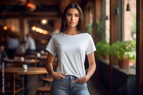 Young woman wearing bella canvas white t shirt and jeans, at a cozy restaurant on summers day. Design tshirt template, print presentation mockup. Ai generated.