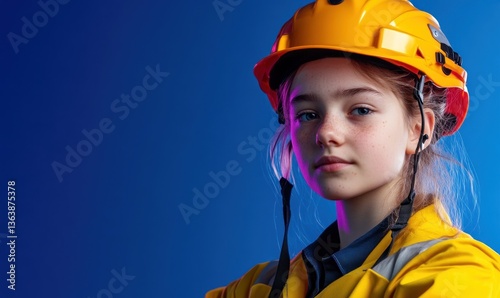 woman, hard hat, safety, men at work, construction, engineer, uniform, young, female, serious, face, portrait, blue, yellow, lighting, industrial, professional, employment, job, career, protection, manufacturing, skill, expertise, confidence, equality, workwear, person, adult, looking, studio, equipment, occupation, safety-gear, headwear, technical, service, business, commercial, stock, image, concept, labor, industry, engineering, manual labor