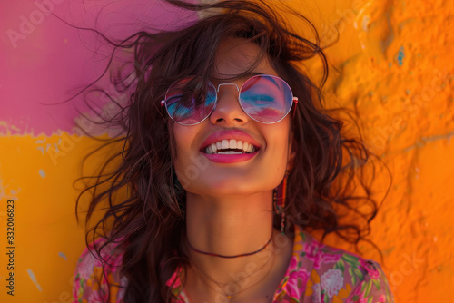 young, beautiful, gorgeous, woman, female, smiling, happy, expression, sunglasses, eyeglass, accessory, spectacle, eyewear, pretty, authentic, candid, goggles, friendly, natural beauty, elegance, adorable, fashionable, glamour, eyeglass, people, successful, concept, colourful, positive, confident, shopping, portrait, cheerful, coiffure, girl, fashion, adult, style, modern, casual attire, lifestyle, stylish, posing, model, standing, attractive, ai, artificial intelligence