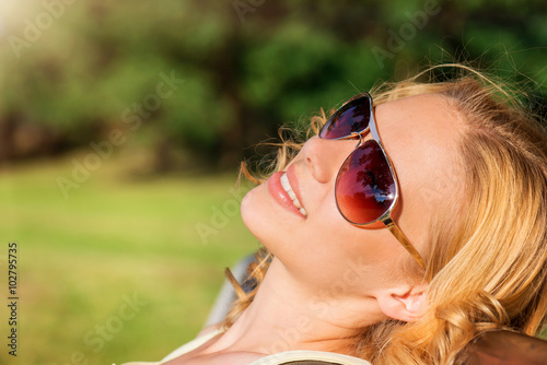 woman, girl, hair, beautiful, spring, summer, face, young, beauty, green, model, pretty, female, happy, adult, smile, make up, white, person, healthy, glamour, woman, attractive, lovely, lady, skin, youth, sunny, sunlight, long, park, outside, nature, romantic, tender, closeup, curly, blond, tree, singlet, yellow, light, fun, joy, teeth, sunglasses, grass, double exposure