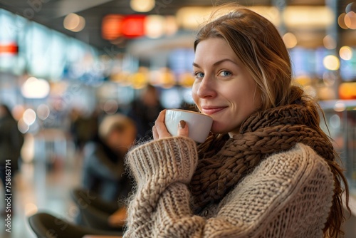 Young woman with a contented expression, enjoying a cup of freshly brewed coffee at an airport café, the rich aroma and warm ambiance providing a comforting start to her travels